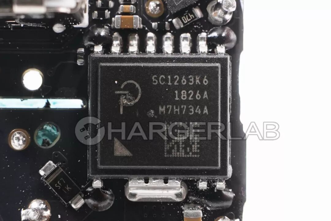 清理完PCB上的保护框架得以看到内部的电源主控芯片和快充协议芯片。其中电源芯片来自美国PI公司,型号为SC1263K6,这是一颗专为苹果公司定制的高集成度电源芯片。PI在电源主控芯片中将初级、次级电路合封为一颗,这是PI的独门绝技。