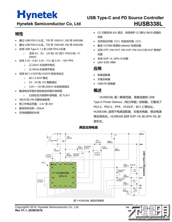 充电头网通过查询资料了解到,Hynetek慧能泰HUSB338L是一颗高性能、高集成度的USB Type-C Power Delivery(电力传输)控制器,它集成了PD3.0、PD2.0、PPS、HVDCP、BC1.2 等协议;并且该芯片目前已经通过了USB PD2.0 认证(TID 号 1000151,XID 号 0005398)和USB PD3.0认证(TID 号 1000189,XID 号 0005399),保证了芯片的兼容性,并可广泛应用于电源适配器、车载充电器、移动电源等应用产品。