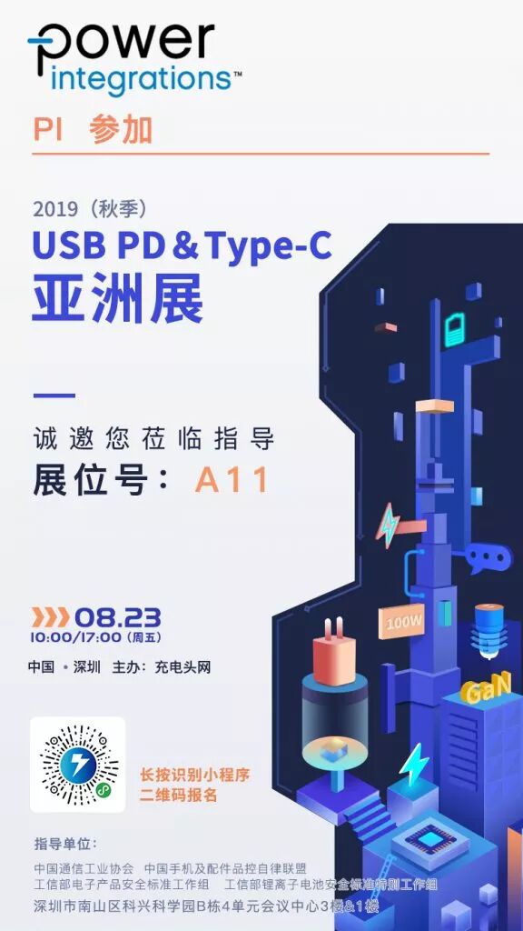Power Integrations将在8月23日参加2019(秋季) USB PD&Type-C亚洲展,展位设在A11,需要了解高集成电源方案的观众可在展会当天前往A11展台进一步交流。