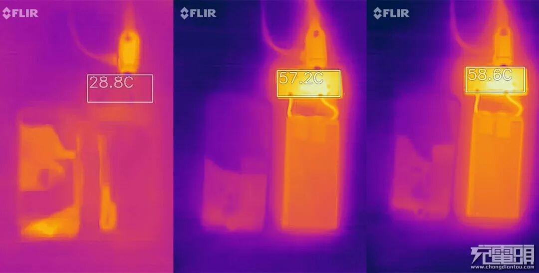 室温26℃的环境下,板子表面初始平均温度为28.8℃;持续输出15分钟后,板面平均温度上升至57.2℃;持续输出30分钟后(此时为整个放电过程中最大负荷状态),板面的平均温度约为58.6℃。整个充充电过程中,DEMO板的平均温度没有超过60℃。
