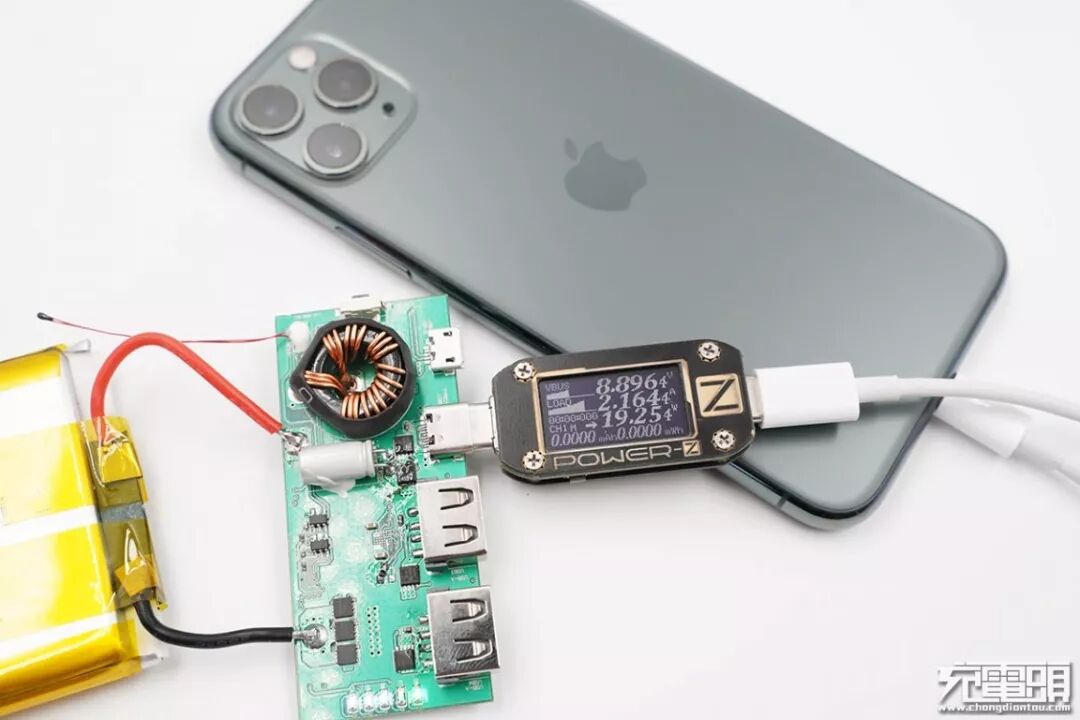 给iPhone 11 Pro充电,显示电压为8.89V,电流约为2.16A,充电功率约为19.25W,成功开启USB PD快充模式。