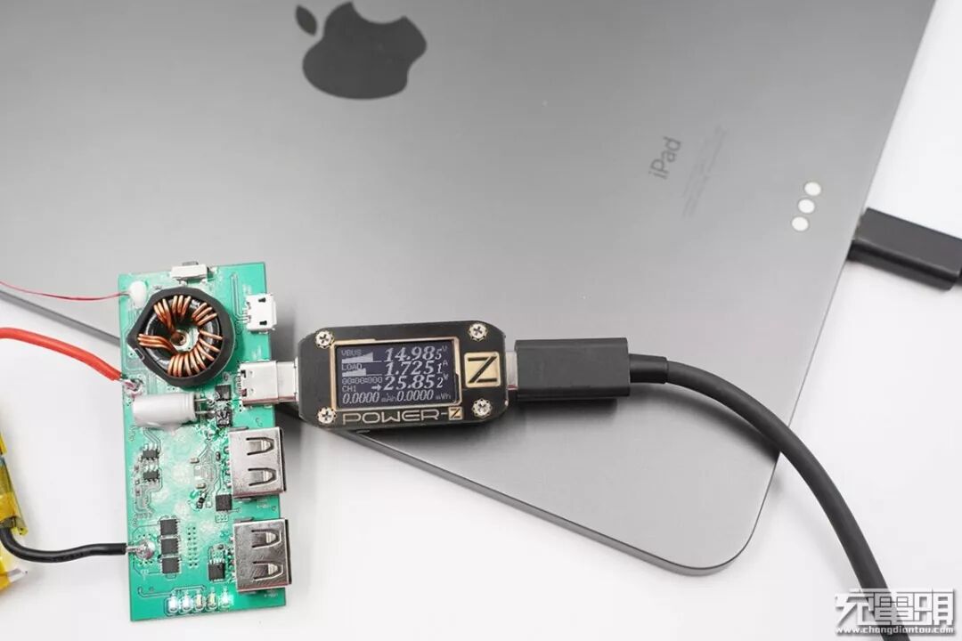 给iPad Pro 11寸充电,显示电压为14.98V,电流约为1.72A,充电功率约为25.85W,成功开启USB PD快充模式。