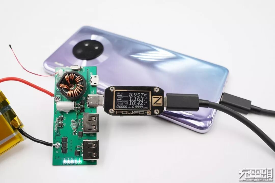 给华为Mate 30充电,显示电压为8.95V,电流约为1.16A,充电功率约为10.42W,成功开启USB PD快充模式。