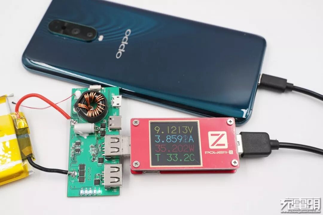 值得一提的是,搭载ELECJET电友套模组的移动电源DEMO通过外挂协议芯片,可以让USB-A接口实现OPPO的10V快充,并且无需借助OPPO原装线缆。实测给Reno Ace充电,电压9.79V,电流为3.86A,充电功率约为37.82W(受电池限制,移动电源DEMO的输出进行了限流处理)。