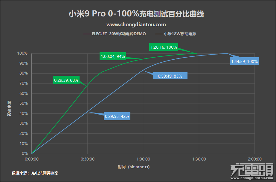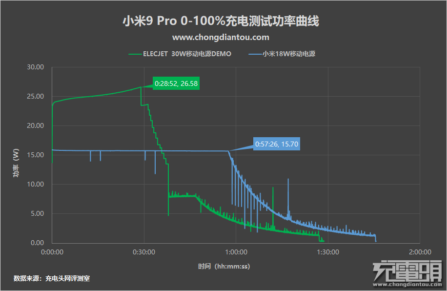 从上文中可以看到,搭载ELECJET电友30W双向PD快充模组的移动电源DEMO板具备非常不错的兼容性,但实际充电速度怎么样呢?为此,充电头网分别测试了这套DEMO和常规18W PD移动电源对小米9 Pro的充电数据。