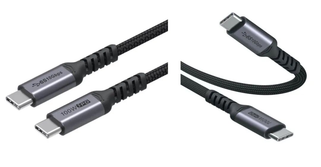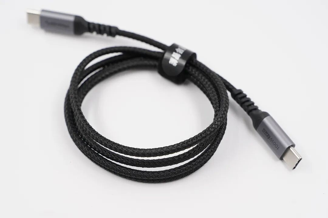 5款全功能同轴线均采用铝合金材质的USB-C接口外壳,表面经过磨砂和样机氧化后呈银灰色,两面分贝印有100W PD和10Gbps字样。线材和USB-C接口连接至采用注塑延长、增强抗弯折特性。