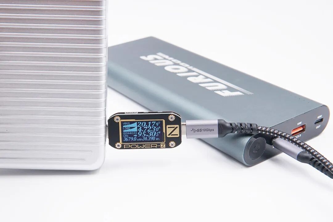 使用同轴科技的全功能线给100W移动电源充电,显示充电电压20.17V,电流4.72A,充电功率约为95.3W,支持100W快充功能。