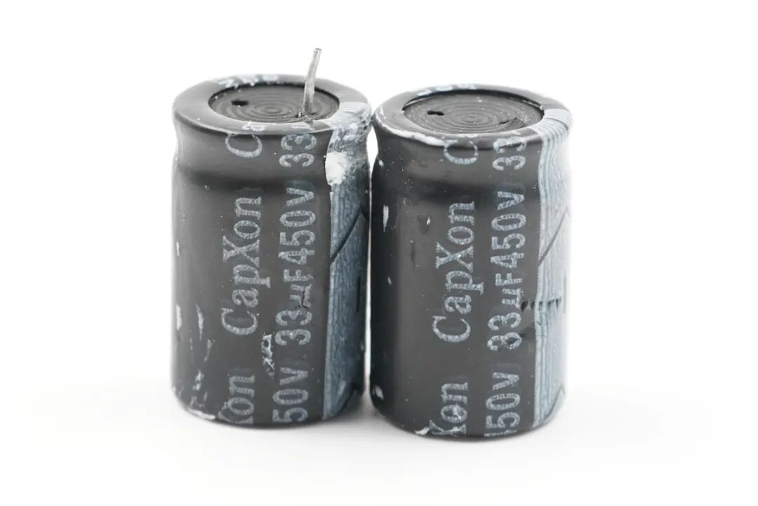 CapXon丰宾的两颗高压滤波电解电容,规格均为450V 33μF,两颗并联为PFC输出滤波。
