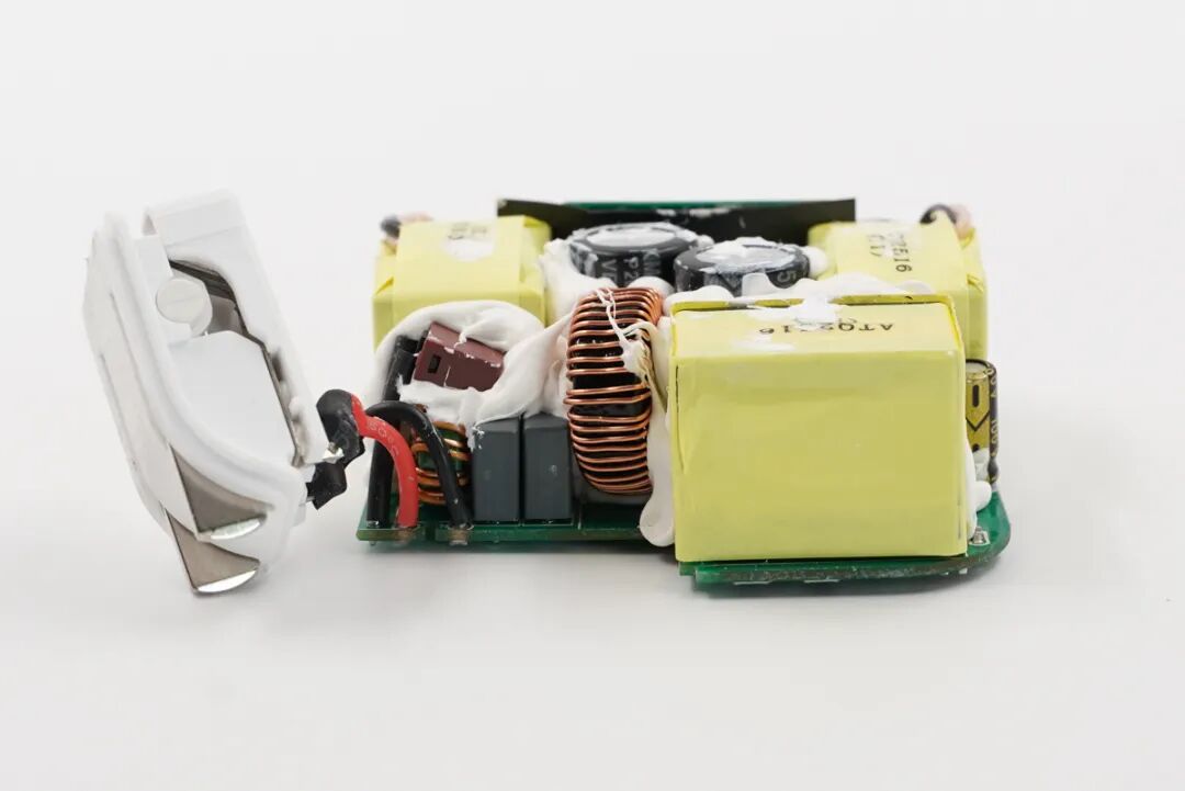 不仅如此,为了满足国内CQC的CCC安规认证要求,这款充电器还在小巧的机身内部加入了PFC功率因数校正电路,内部元器件布局十分紧凑。下面就和大家分享这款充电器的拆解,看看其内部的具体用料和做工。