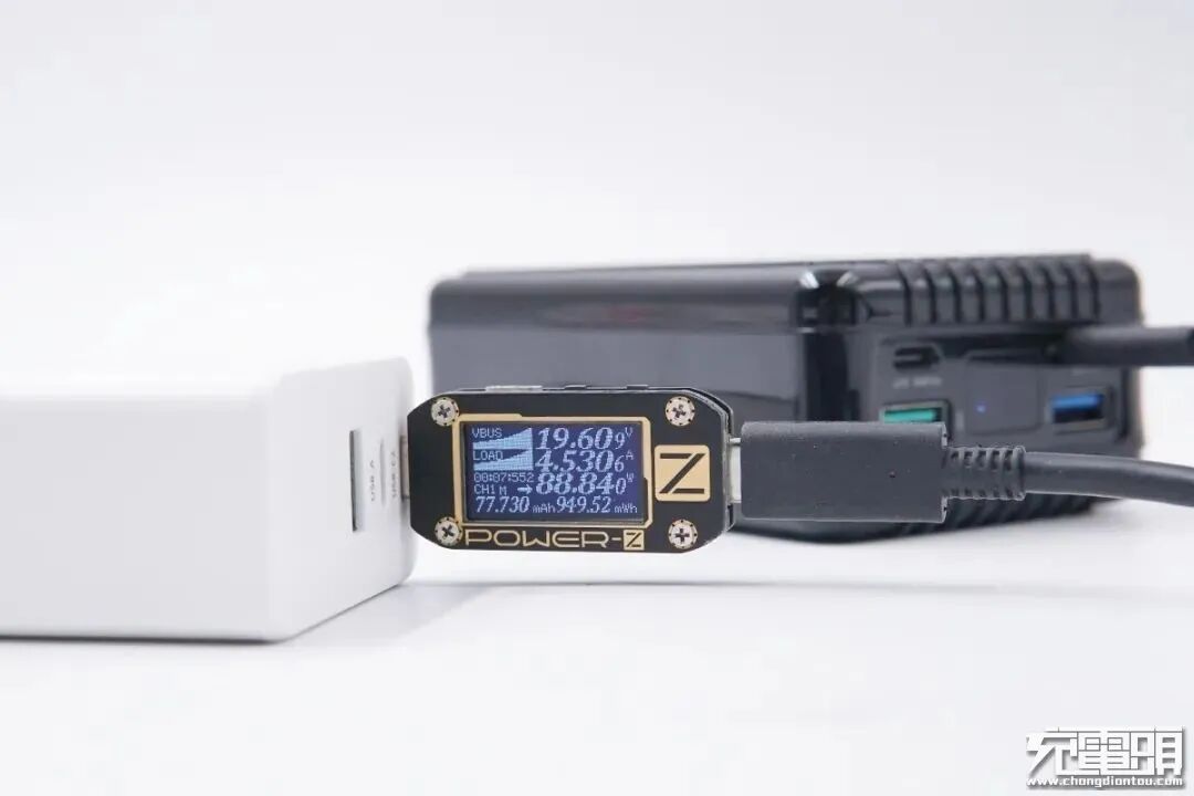使用雅晶源90W氮化镓快充给100W移动电源供电,测得电压19.6V,电流4.53A,充电功率约为89W。
