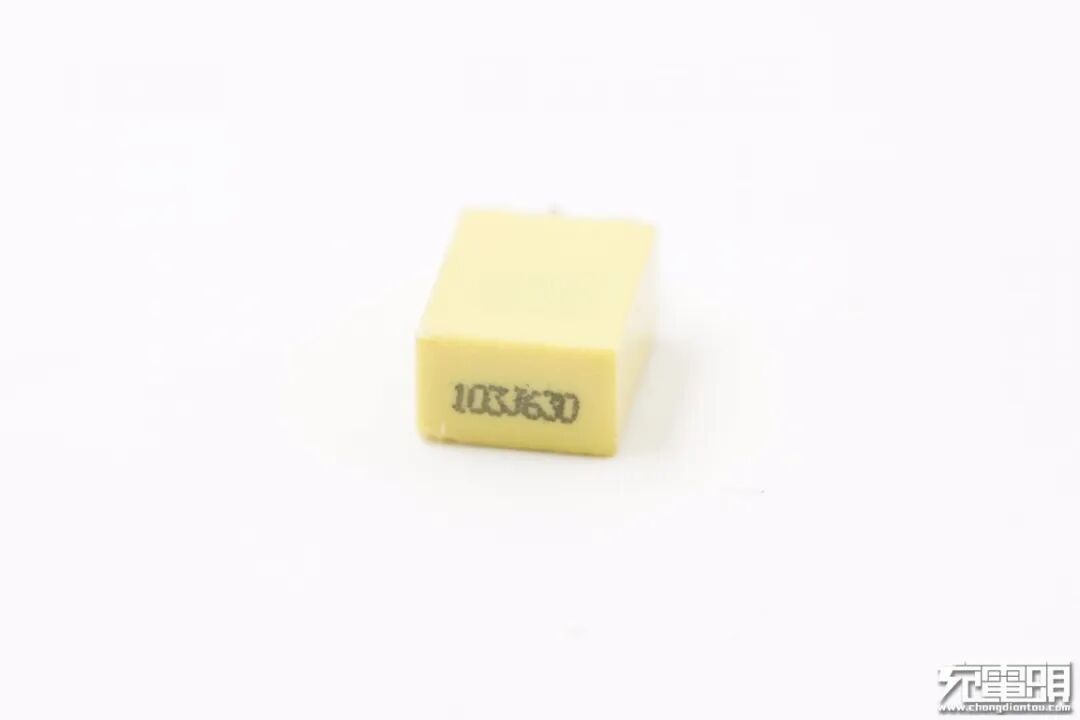 旁边是一颗深圳市特锐祥电子有限公司的Y电容,采用黑色注塑外壳,贴片封装,有利于充电器的高集成度,非常适合氮化镓充电器的设计,但成本比传统插件式Y电容更高。