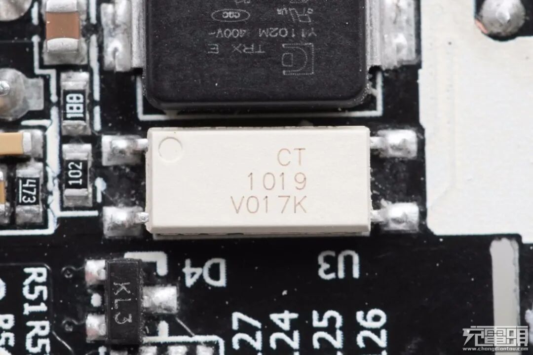 CT 1019光耦特写,横跨在初级和次级之间,用于初级次级通信,调节反馈输出电压。