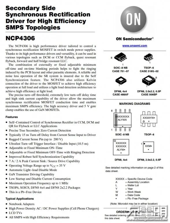安森美 NCP4306 详细资料。充电头了解到,该芯片此前已被贝尔金68W双C口GaN充电器、魅族65W氮化镓充电器、鸿达顺65W 2C1A氮化镓快充充电器、HYPER HUICE 100W氮化镓充电器、ROCK 65W氮化镓快充充电器采用。