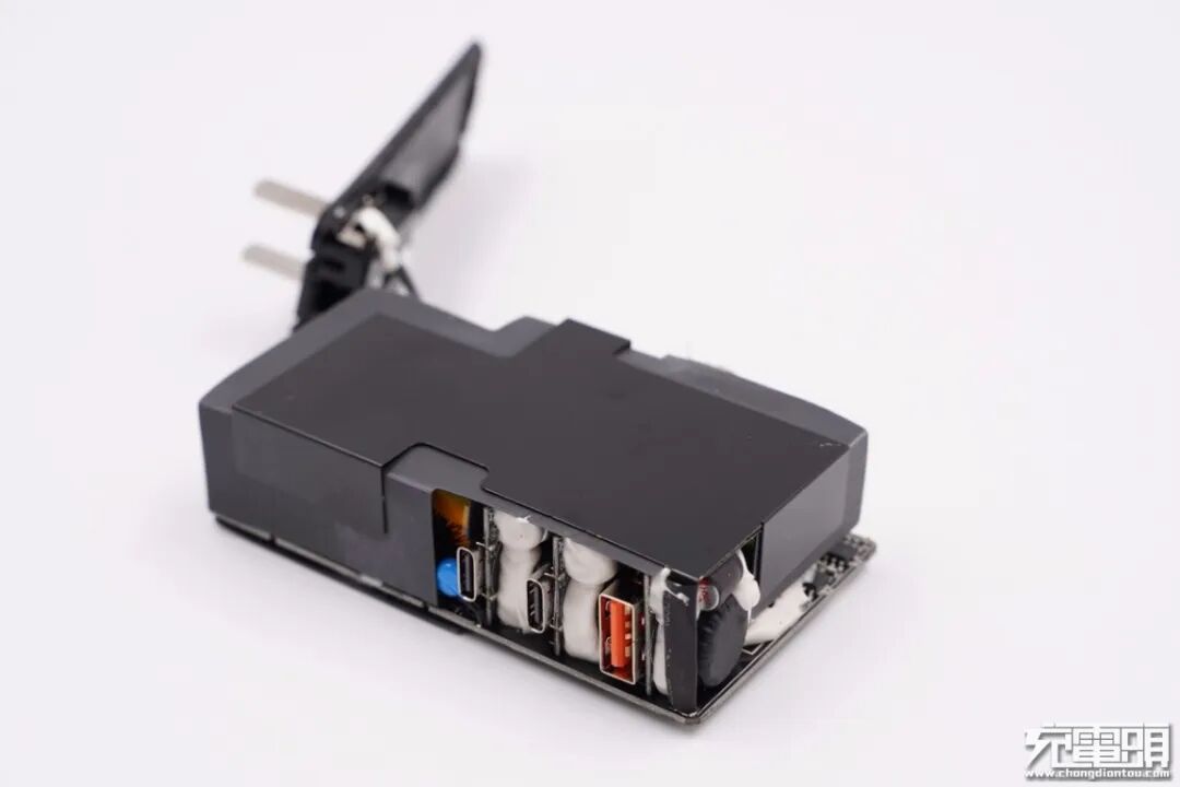 此外PCB板正背面元器件大多注胶处理,而且还配有隔离板和散热片,增强内部稳定性和散热性能;输入输出端电容外套绝缘管,二次滤波固态电容的设置保证输出纯净。充电器内部细节讲究,整体做工扎实。