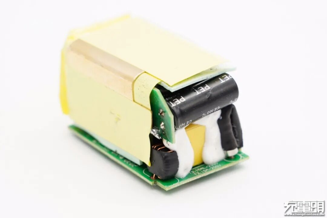 充电器顶部以及侧面均配有黄铜散热片,并且和元器件以及侧面小板之间设有导热垫,自身包裹绝缘胶带。
