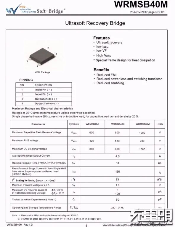 输入端两颗WRMSB40M整流桥,用于均摊发热,降低温升。WRMSB40M来自深圳市沃尔德实业有限公司,这颗软桥通过较软的恢复曲线,比较平滑的关断特性,可以降低二极管结电容达到非常少的谐波振荡产生的效果。