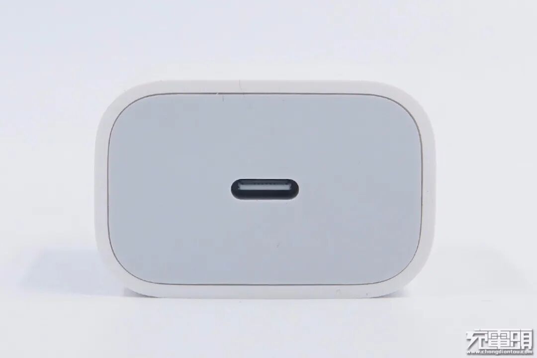 输出顶面设有USB-C接口,白色舌片,且居中设计。端面呈浅灰色,与白色烤漆亮面非常搭。性能方面支持仅USB PD2.0快充协议,具备5V 3A和9V 2.22A两组输出PDO电压档位。