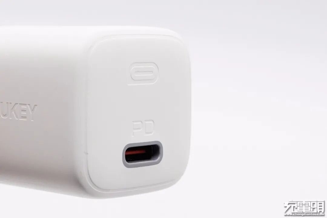 AUKEY 20W 迷你PD充电器共有黑白双色可选,哑光表面处理工艺,通过亮面做出丝印,看上去十分精致。充电器侧面带有AUKEY商标,正面USB-C输出口上标注了PD字眼,并带有一个工作指示灯。
