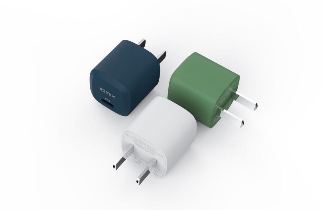 IDMIX大麦创新20W PD快充充电器有白、绿色、蓝三种配色,采用极为迷你的机身,看起来与苹果5W充电器相当。同时,充电器机身设计较为圆滑,输入端面通过倒棱设计,突出了产品的体积感。