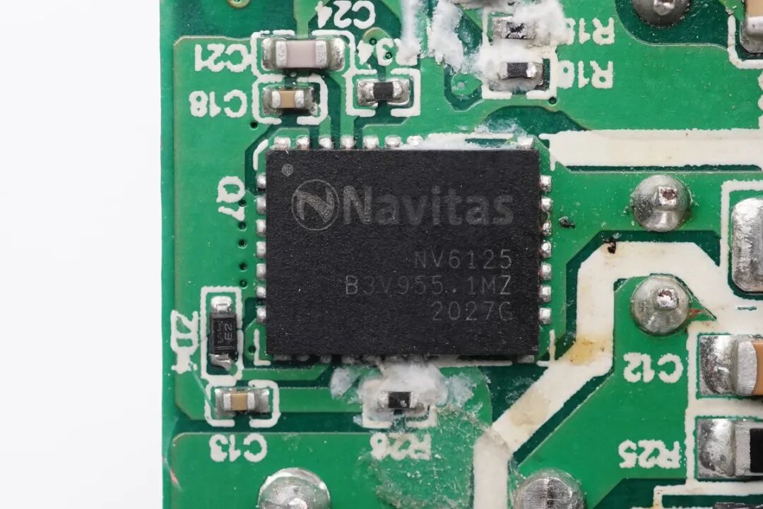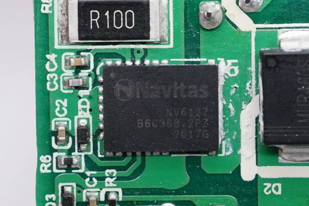 PFC开关管采用氮化镓功率芯片,纳微NV6127,相比NV6117散热升级,更大的散热焊盘,125mΩ导阻,内置驱动器支持10-30V供电。最高支持2MHz开关频率。