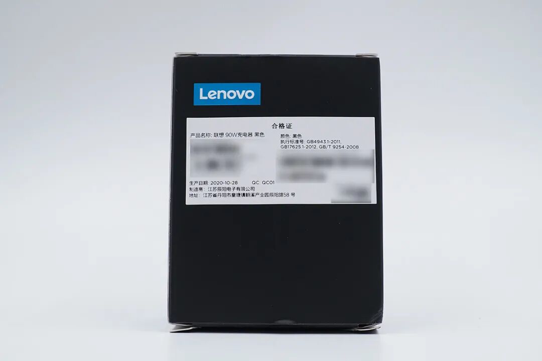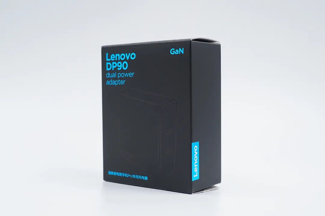 联想90W双USB-C氮化镓充电器采用纯黑色白装盒,搭配青色字体,看起来比较别致。正面印有Lenovo DP90 dual power adapter以及GaN字样。