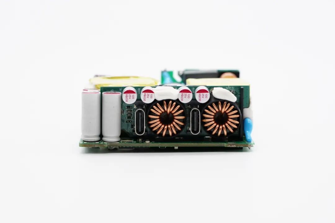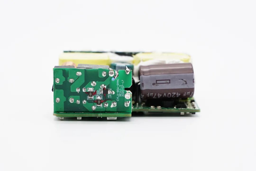 输出端设有二次降压小板,USB-C母座垂直焊接在小板上,从电容和电感数量以及分布位置来看,采用的是两路独立降压电路。