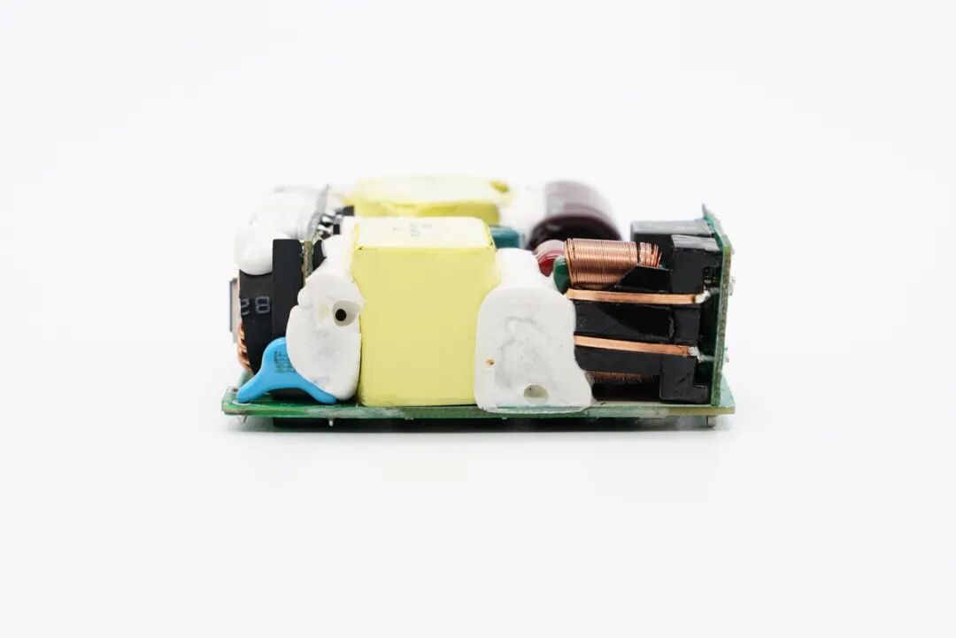 PCB板另一侧一览,设有第三颗高压滤波电解电容,以及变压器和同步整流输出滤波固态电容。