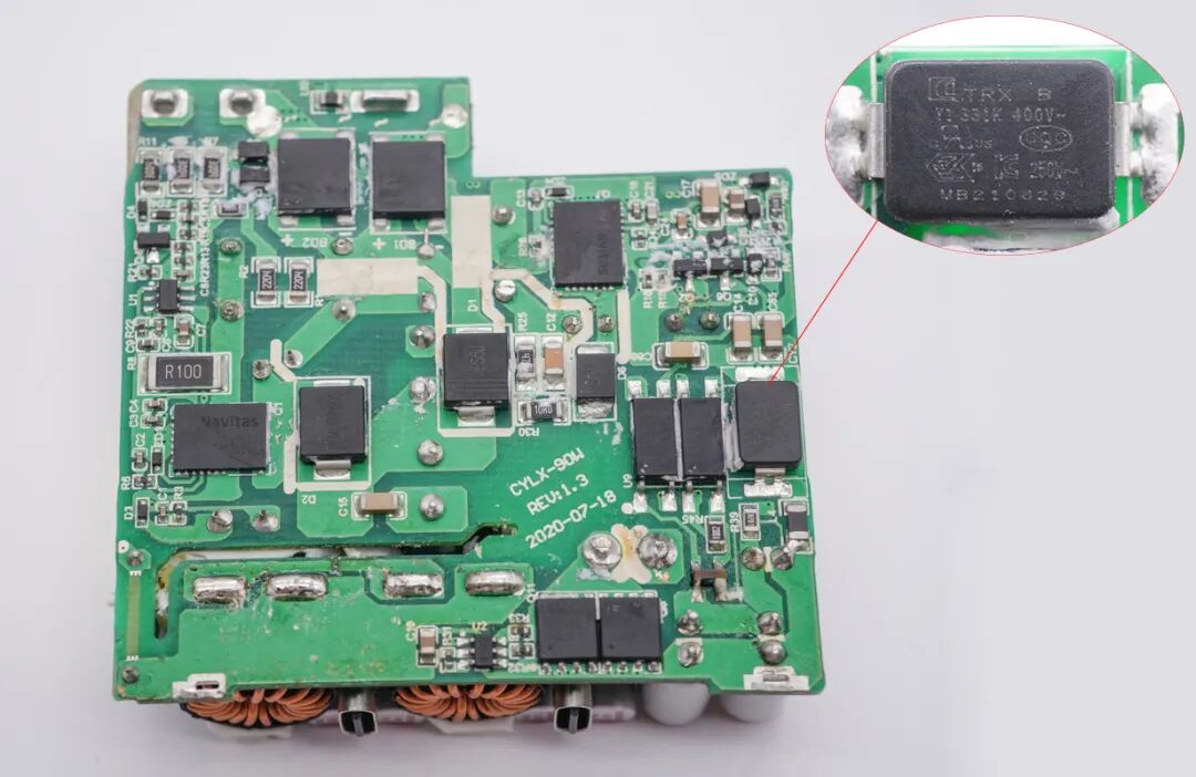 光耦旁边贴片Y电容来自四川特锐祥科技股份有限公司,具有体积小、重量轻等特色,非常适合应用于氮化镓快充这类高密度电源产品中。