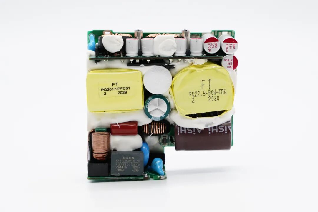 PCB板正面一览,输入输出端均设有小板,元器件打胶固定,APFC升压电感以及变压器设在两侧,整体布局整齐紧凑。