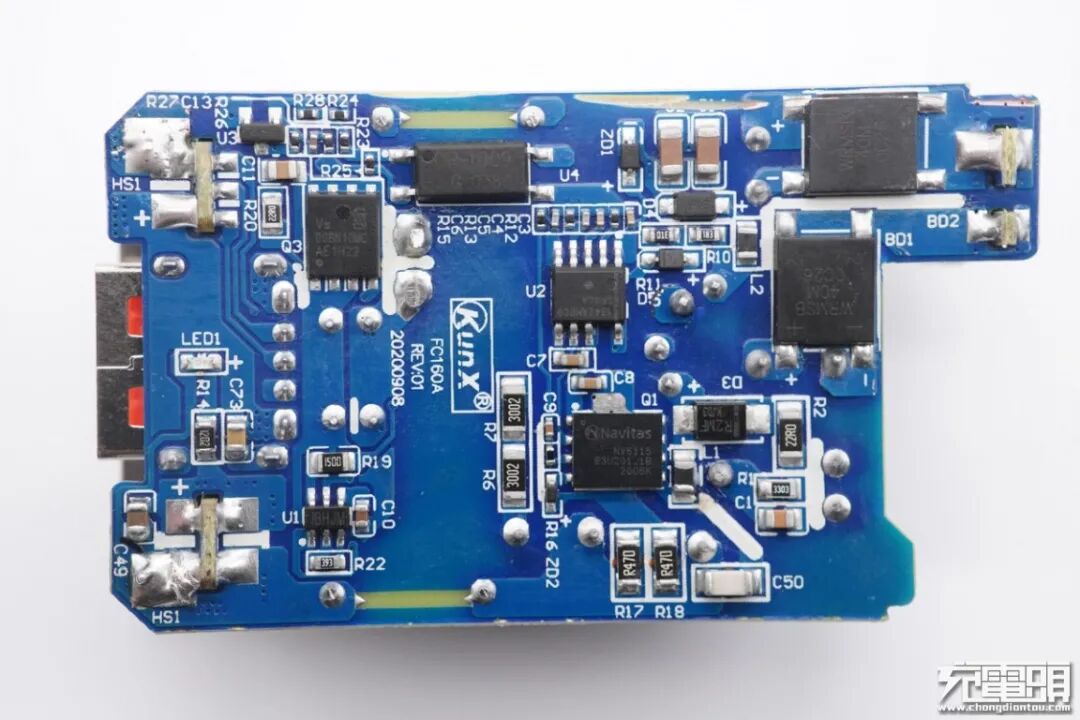 PCB板背面一览,光耦横跨在初次级之间,中心处印有KunX品牌logo。