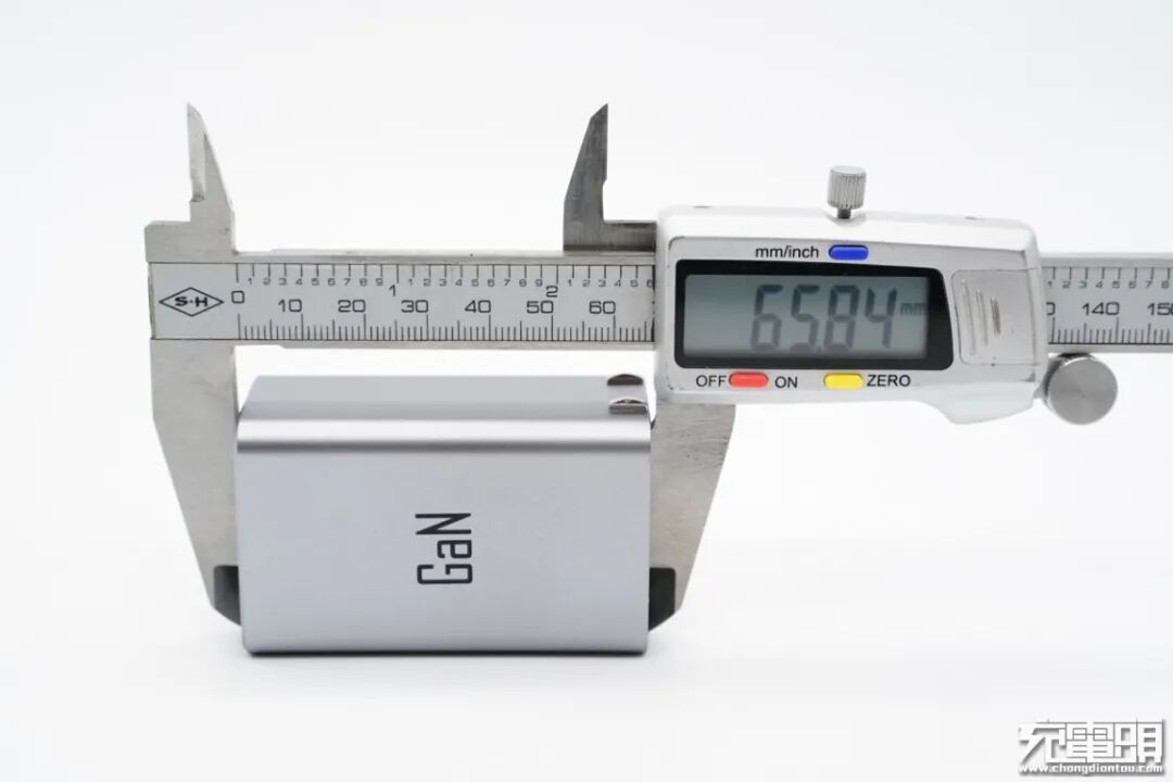 使用游标卡尺实测充电器机身长65.84mm。