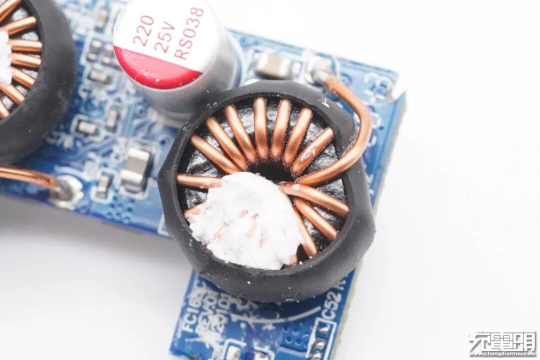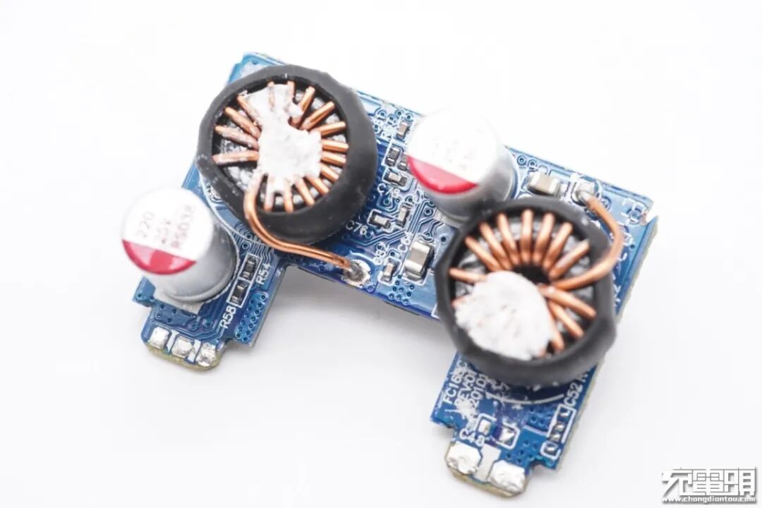 充电器初级侧元器件上覆盖有蓝色导热垫,输出端设有二次降压小板。