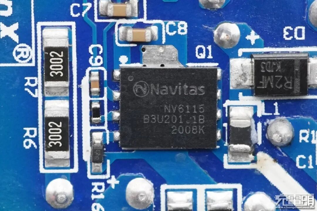 初级侧氮化镓功率芯片采用纳微NV6115,这是充电器的核心元器件。NV6115内置驱动器以及复杂的逻辑控制电路,170mΩ导阻,耐压650V,支持2MHz开关频率,采用5*6mm QFN封装,节省面积,得益于NV6115内置驱动器,无需外置驱动器,更加节省PCB空间。