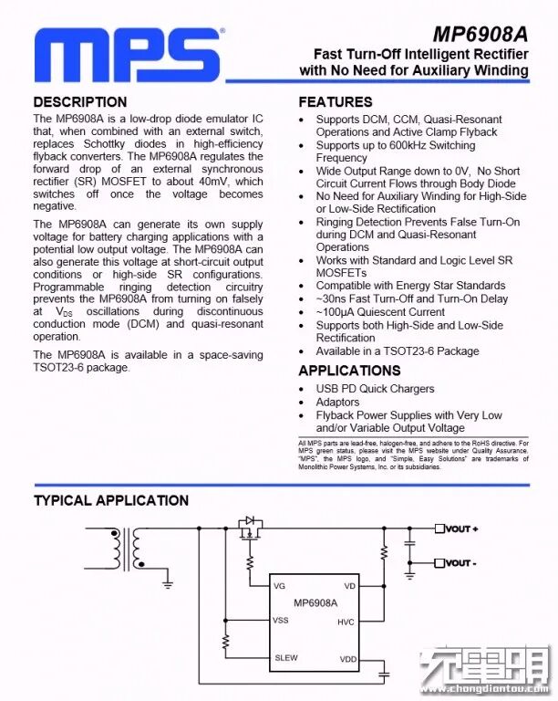 丝印IBHJM次级同步整流控制器,实际型号为MP6908A,来自MPS芯源半导体,最高工作频率600KHz。