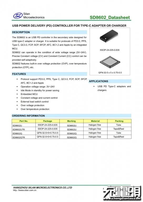 士兰微SD8602支持USB PD3.0,PPS、USB-C、QC3.0、FCP、SCP、SFCP、AFC、BC1.2型和Apple2.4A等充电协议。芯片内置MCU,外置负载开关管。
