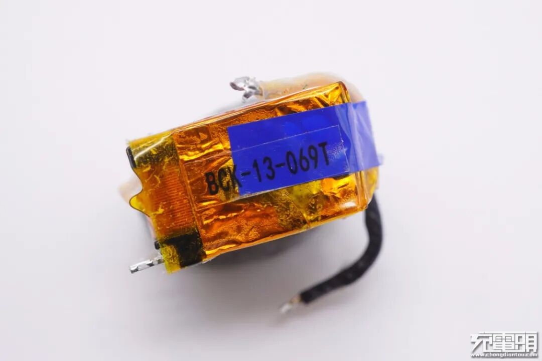 变压器特写,磁芯包铜箔屏蔽,整个使用绝缘胶带包裹。