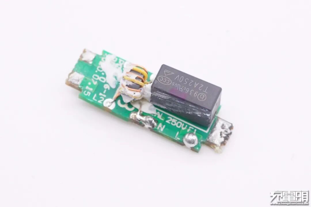 经过对充电器观察分析发现,雷柏20W PD快充充电器采用开关电源宽范围输出,再由PD协议芯片通过光耦控制输出电压的架构。下面就由输入端开始为大家一一介绍这款产品的用料。