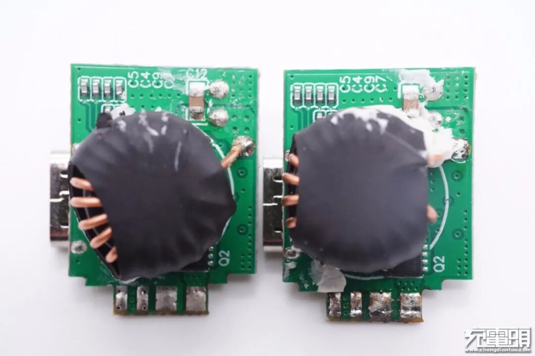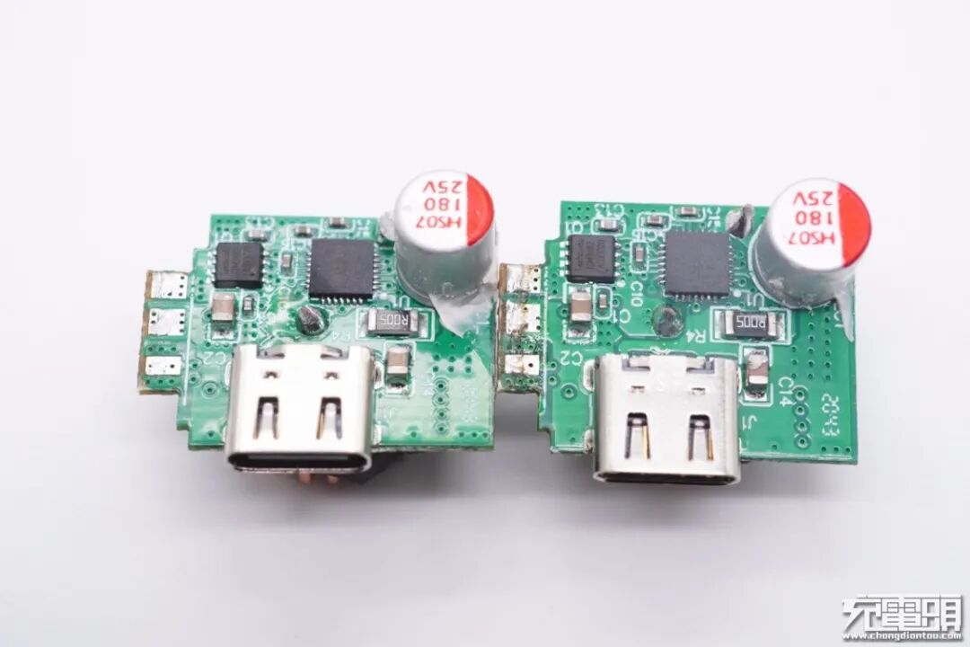 两个C口母座所在小板设计一模一样,正面均设有降压协议IC、MOS管以及固态电容。