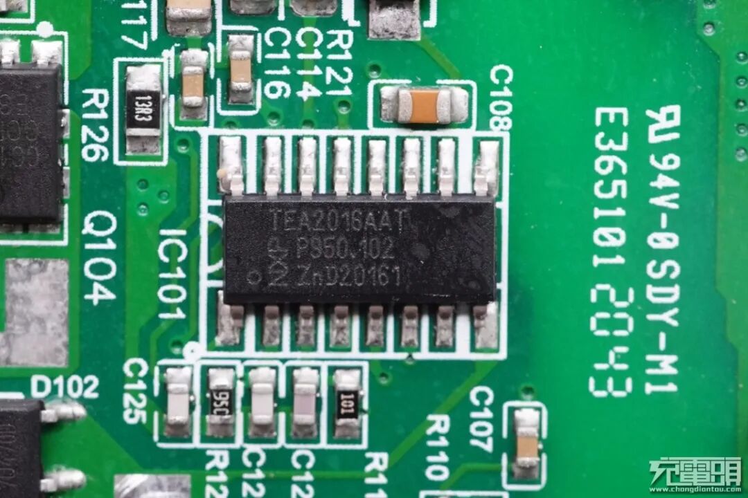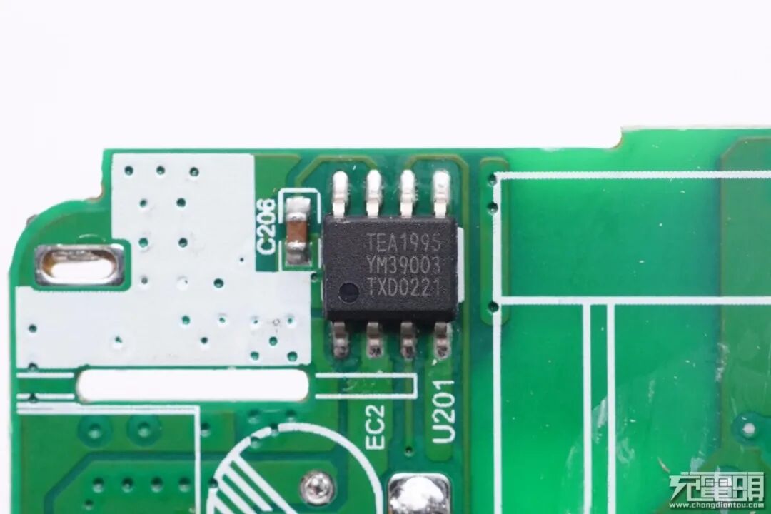 充电器初级PWM主控芯片采用NXP恩智浦TEA2016AAT,一颗芯片内置LLC控制器和PFC控制器,内置数字架构控制,简化了设计的同时减少外围元件数量,芯片内置多重完善的保护功能。