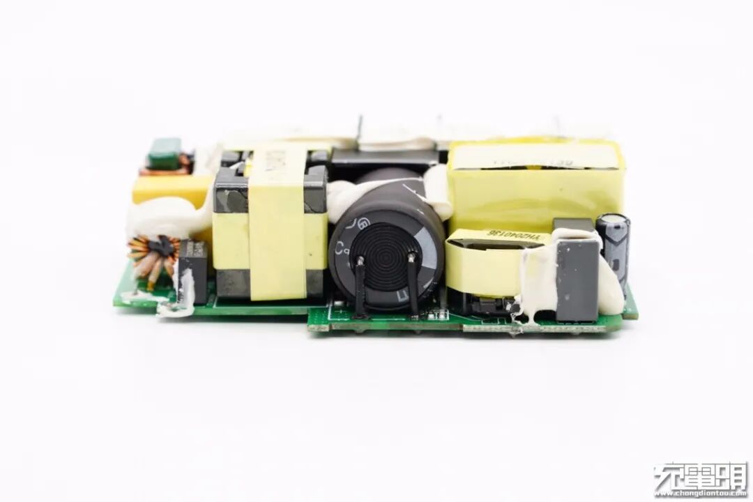 PCB板上元器件布局紧凑有序,初次级之间设有塑料隔离板,正背面设有大面积黄铜散热片,保证高功率充电状态下的散热性能。此外输入端采用昱光电解电容进行滤波,输出端设有二次滤波固态电容进行滤波,输出纯净。