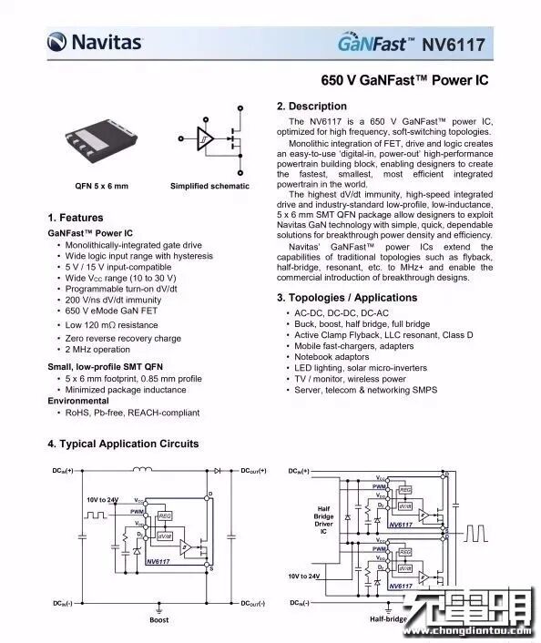 纳微半导体NV6117详细资料。采用这款芯片的还有戴尔90W氮化镓充电器、HYPER JUICE 100W氮化镓充电器、小米GaN充电器Type-C 65W、ROxANNE 66W氮化镓USB PD双口快充充电器、Anker PowerCore Fusion PD超极充等。