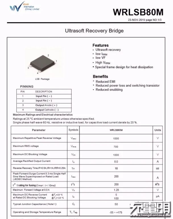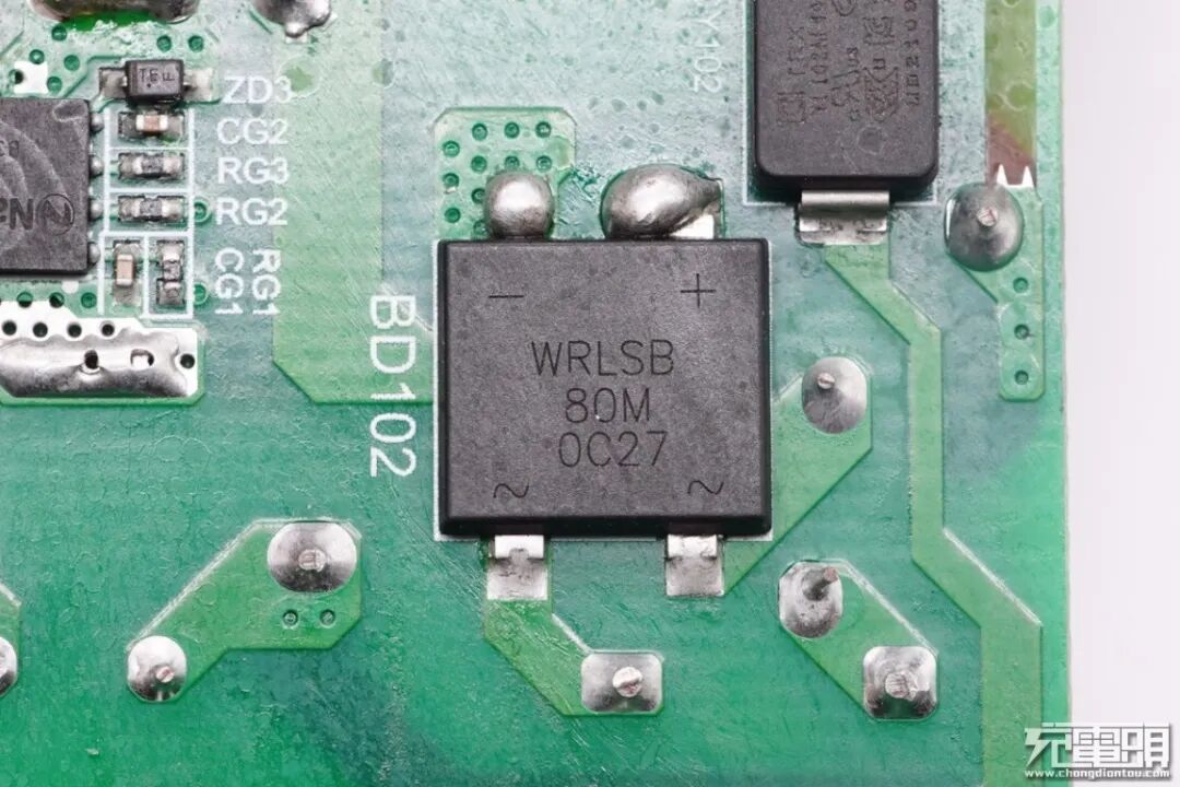 输入端整流桥WRLSB80M来自深圳市沃尔德实业有限公司,这颗软桥通过较软的恢复曲线,比较平滑的关断特性,可以降低二极管结电容达到非常少的谐波振荡产生的效果。选用的LSB封装,拥有良好的散热特性,帮助中大瓦数适配器提升可靠性,单颗可做60W+。