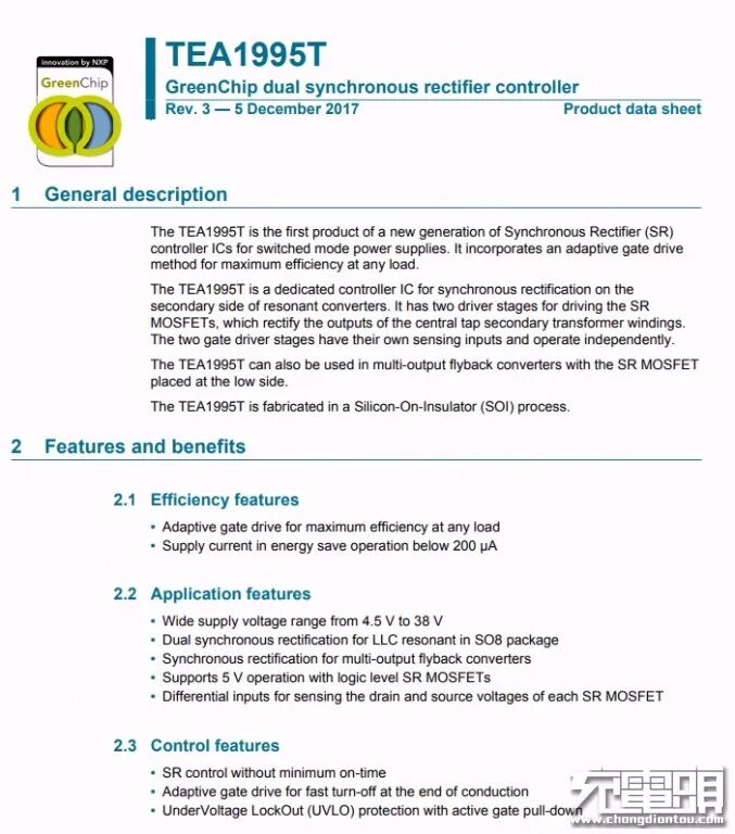 次级同步整流控制器采用恩智浦TEA1995T,其内置两个驱动器用于LLC架构开关电源的同步整流,外围元件精简。