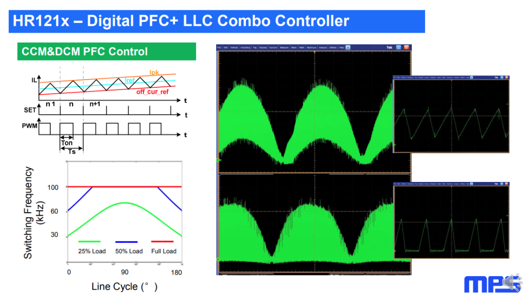 HR1211全部功能和参数均可使用图形界面通过UART接口进行配置,PFC级采用CCM/DCM混合控制,在10%的负载下可实现功率因数>90%,几乎没有模拟的PFC控制器可以达到这个效果。