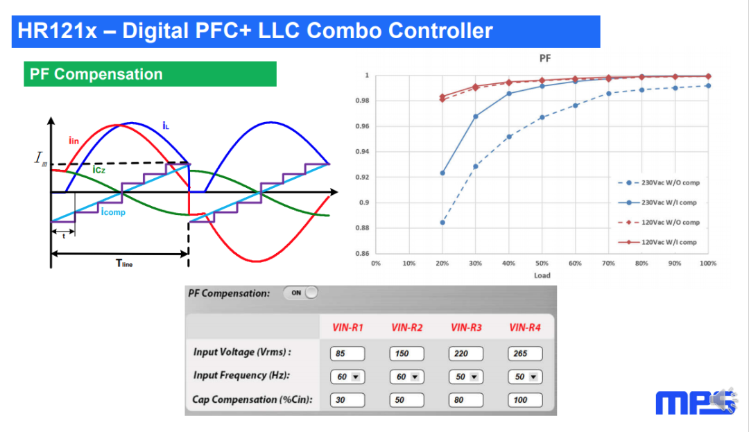 HR1211内置的PFC电路,可补偿开关电源中电容产生的容性电流,数字控制可针对容值和输入电压和补偿幅度进行补偿,这也是模拟PFC控制器无法做到的,可以在宽负载幅度得到90%以上的功率因数。
