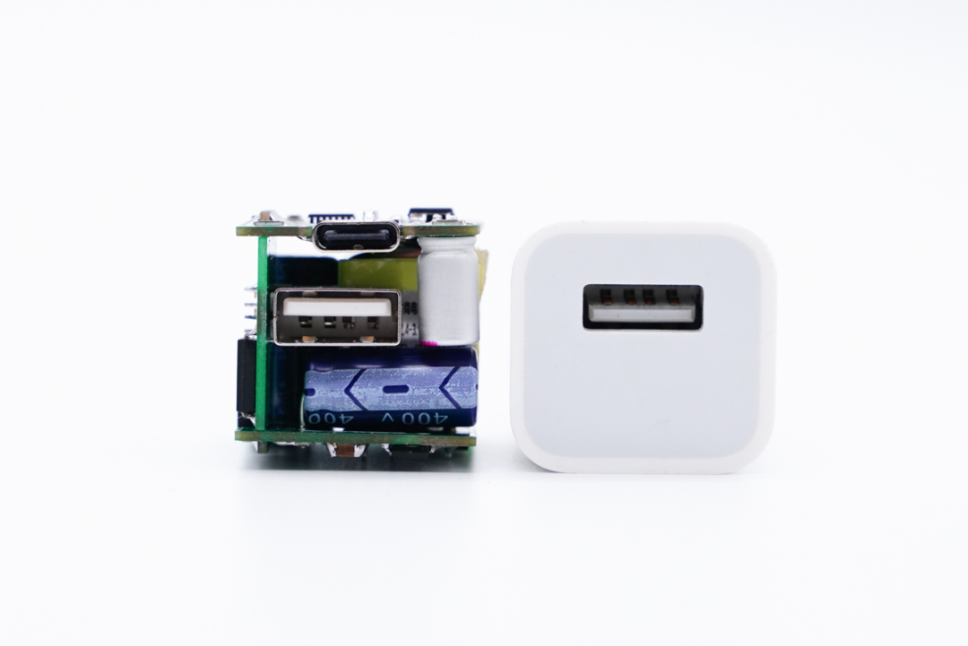 诚芯微这款双口25W PD快充方案虽然功率翻了5倍,并且配备了1A1C两个接口,但整体尺寸和苹果5W充电头大小相当。