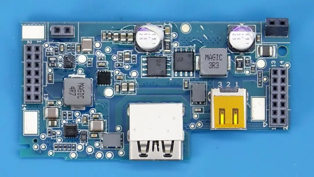 小板另一面一览,左侧是USB-A口输出降压电路,右侧则是笔记本升压输出电路,母座贴有黄色防尘胶带。