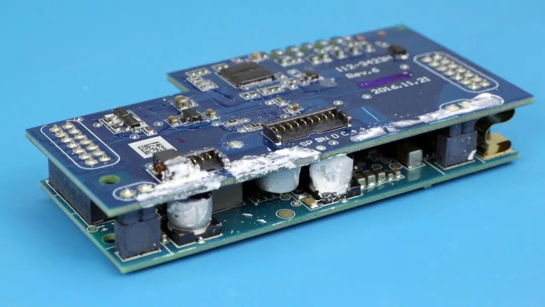 移动电源内的PCB板有两块,之间通过两侧的排针连接。