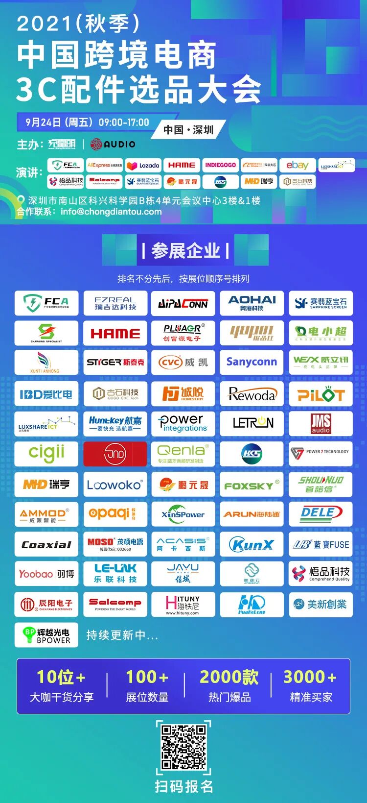 2021(秋季)中国跨境电商3C配件选品大会将于9月24日(周五)在深圳举办,56家快充电源厂商将带来近千款热门产品。