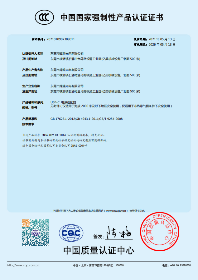 辉越光电20W 1A1C双口充电器于2021年5月13日获得CCC认证,有效期至2026年5月13日。